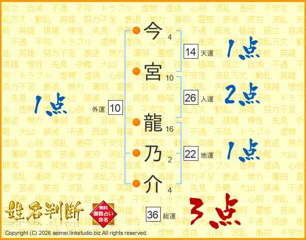 今(4画)宮(10画) 龍(16画)乃(2画)介(4画)