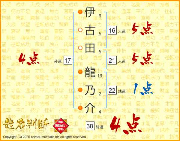 伊(6画)古(5画)田(5画) 龍(16画)乃(2画)介(4画)