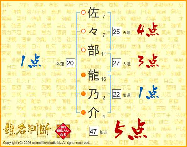 佐(7画)々(7画)部(11画) 龍(16画)乃(2画)介(4画)
