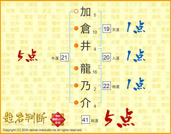加倉井龍乃介さんの総運は41画の5点!