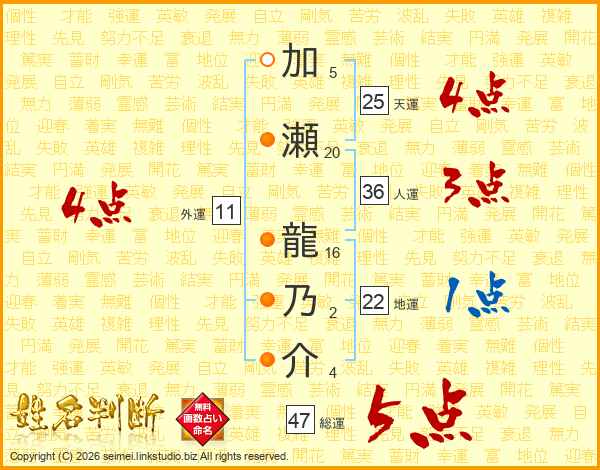 加瀬龍乃介さんの総運は47画の5点!