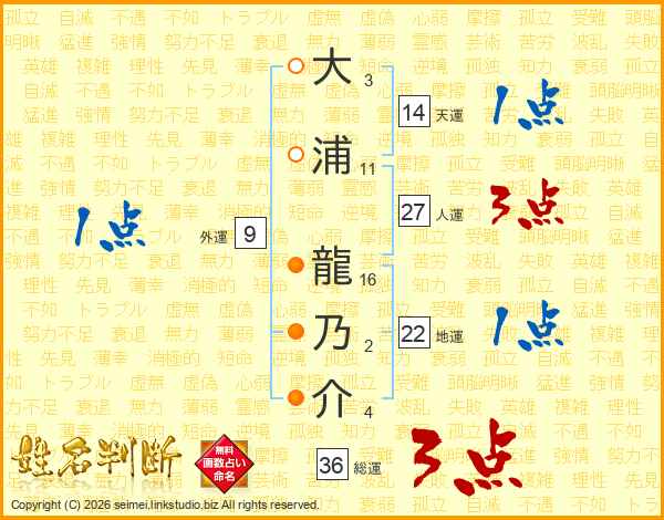 大(3画)浦(11画) 龍(16画)乃(2画)介(4画)