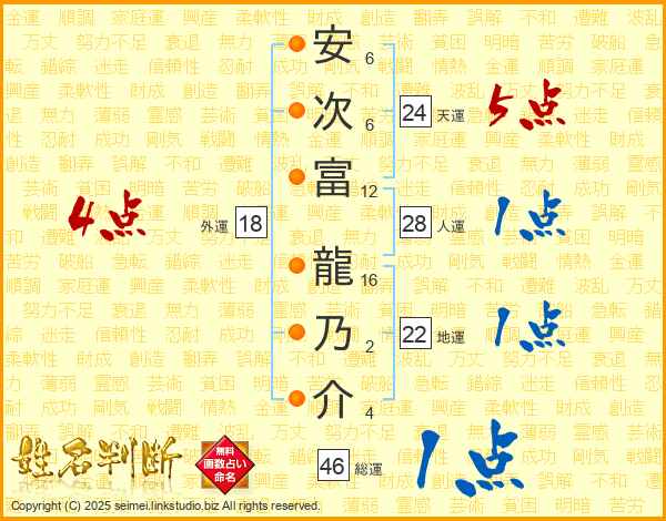 安(6画)次(6画)富(12画) 龍(16画)乃(2画)介(4画)