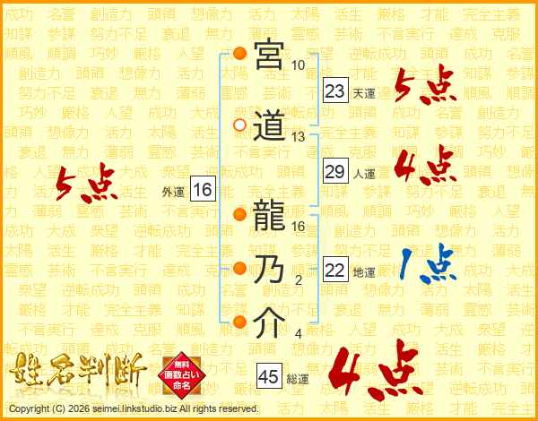 宮(10画)道(13画) 龍(16画)乃(2画)介(4画)