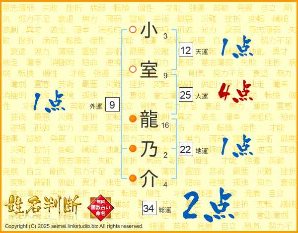 小室龍乃介さんの人運は25画の4点!
