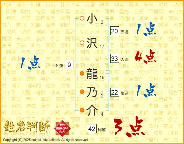 小(3画)沢(17画) 龍(16画)乃(2画)介(4画)