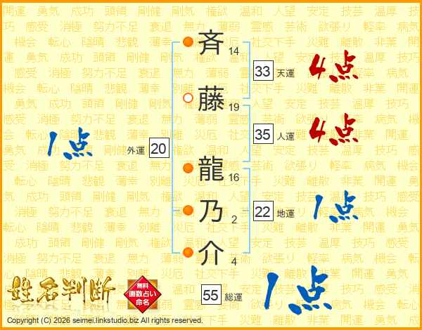 斉(14画)藤(19画) 龍(16画)乃(2画)介(4画)