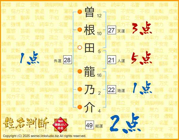 曽根田龍乃介さんの天運は27画の3点!