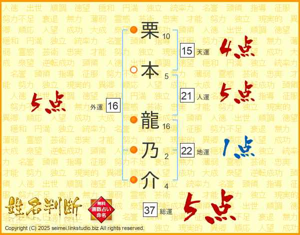 栗(10画)本(5画) 龍(16画)乃(2画)介(4画)