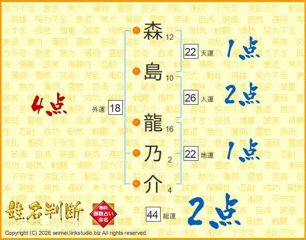 森島龍乃介さんの総運は44画の2点!
