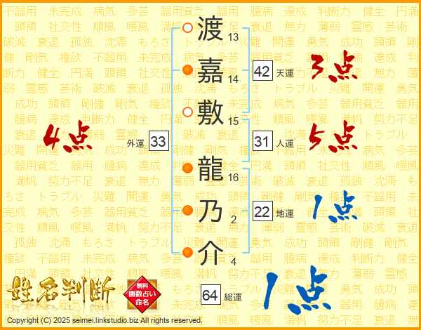 渡嘉敷龍乃介さんの外運は33画の4点!