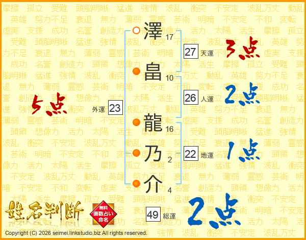 澤畠龍乃介さんの総運は49画の2点!