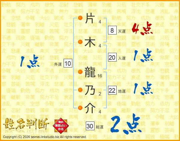 片(4画)木(4画) 龍(16画)乃(2画)介(4画)