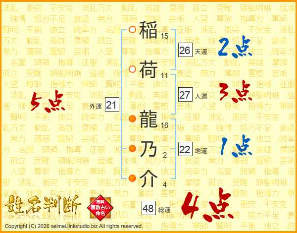 稲荷龍乃介さんの総運は48画の4点!