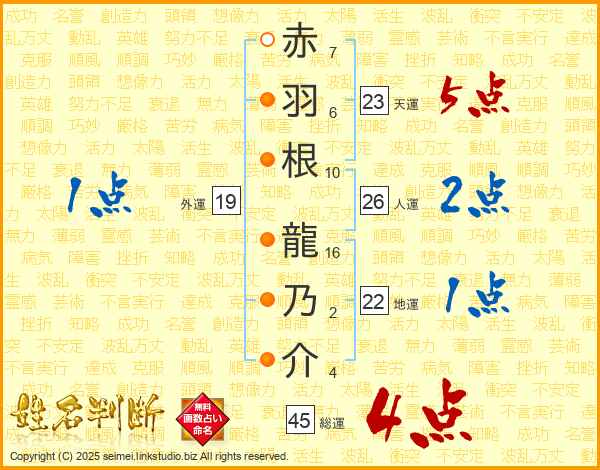 赤(7画)羽(6画)根(10画) 龍(16画)乃(2画)介(4画)