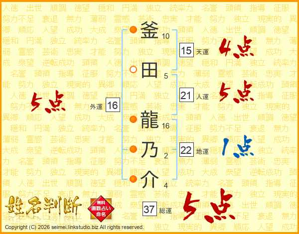 釜田龍乃介さんの総運は37画の5点!