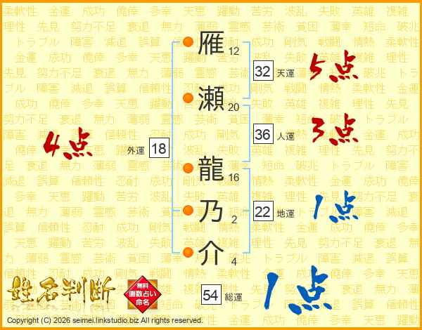 雁(12画)瀬(20画) 龍(16画)乃(2画)介(4画)