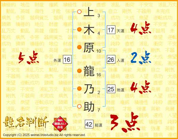 上(3画)木(4画)原(10画) 龍(16画)乃(2画)助(7画)