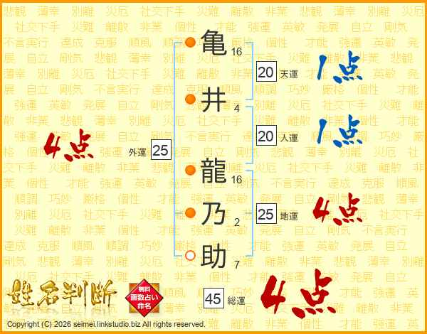 亀(16画)井(4画) 龍(16画)乃(2画)助(7画)