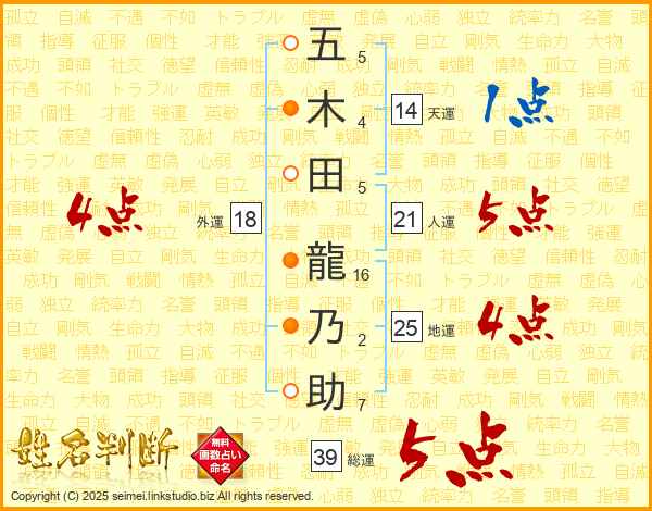 五(5画)木(4画)田(5画) 龍(16画)乃(2画)助(7画)