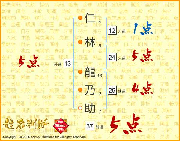 仁(4画)林(8画) 龍(16画)乃(2画)助(7画)