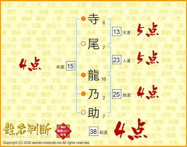 寺(6画)尾(7画) 龍(16画)乃(2画)助(7画)