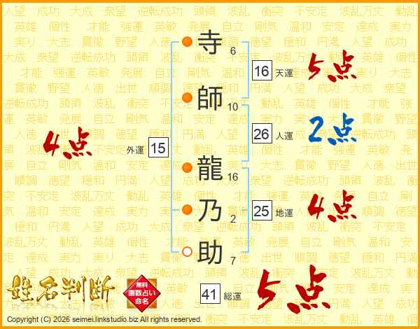 寺(6画)師(10画) 龍(16画)乃(2画)助(7画)