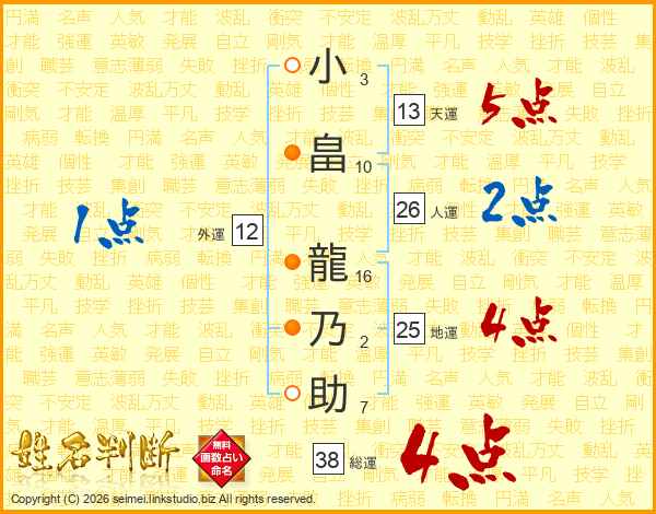 小畠龍乃助さんの総運は38画の4点!