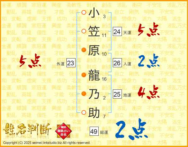 小(3画)笠(11画)原(10画) 龍(16画)乃(2画)助(7画)