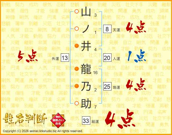 山ノ井龍乃助さんの総運は33画の4点!