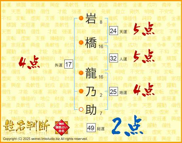 岩(8画)橋(16画) 龍(16画)乃(2画)助(7画)