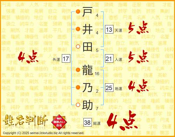 戸井田龍乃助さんの総運は38画の4点!