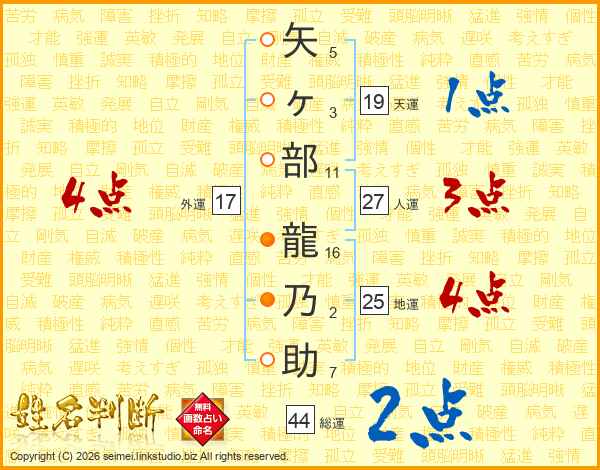 矢ヶ部龍乃助さんの総運は44画の2点!