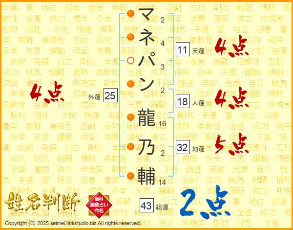 マ(2画)ネ(4画)パ(3画)ン(2画) 龍(16画)乃(2画)輔(14画)
