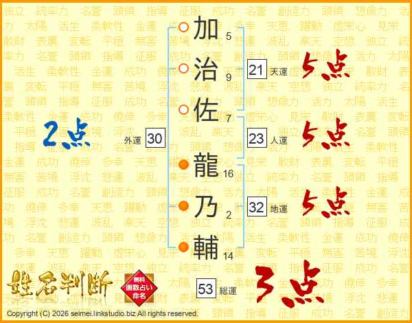 加(5画)治(9画)佐(7画) 龍(16画)乃(2画)輔(14画)