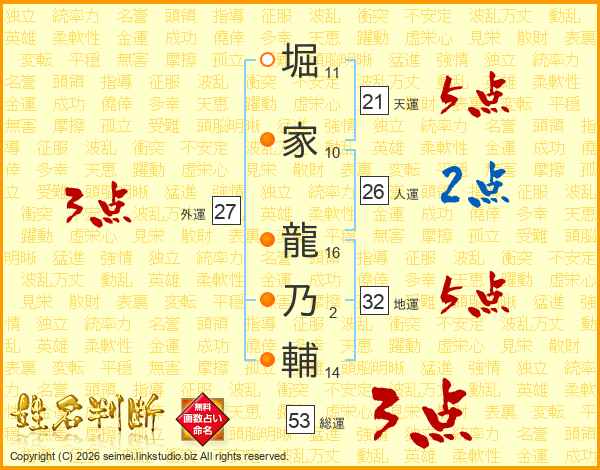 堀(11画)家(10画) 龍(16画)乃(2画)輔(14画)