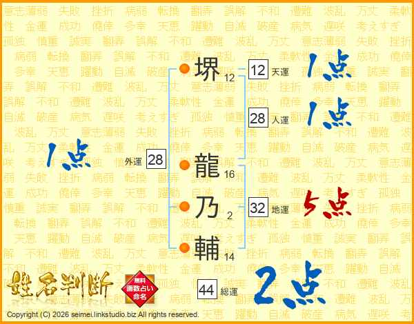 堺(12画) 龍(16画)乃(2画)輔(14画)