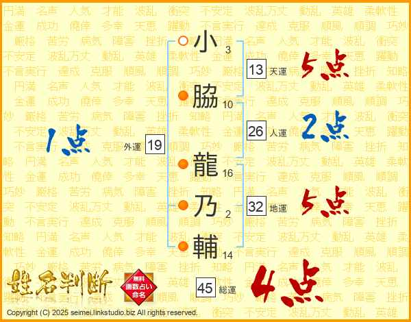 小脇龍乃輔さんの総運は45画の4点!