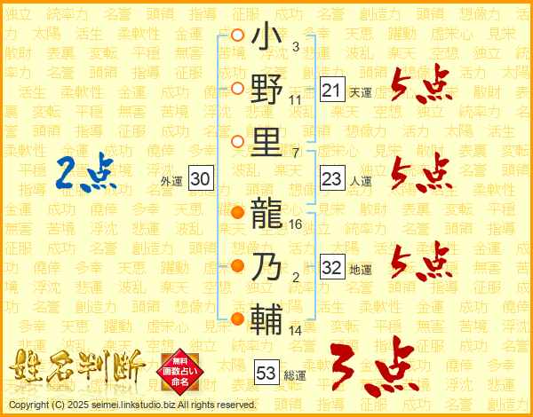 小(3画)野(11画)里(7画) 龍(16画)乃(2画)輔(14画)
