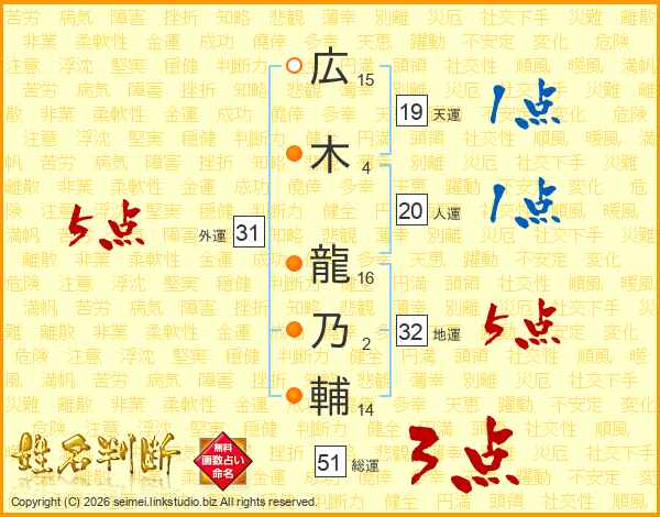 広(15画)木(4画) 龍(16画)乃(2画)輔(14画)