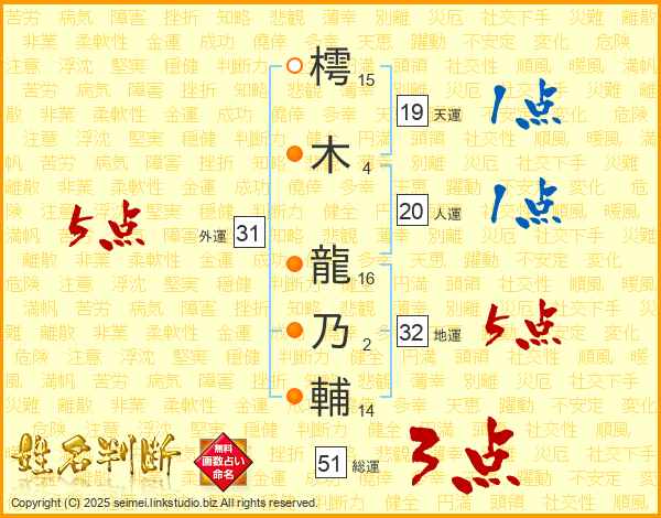 樗(15画)木(4画) 龍(16画)乃(2画)輔(14画)