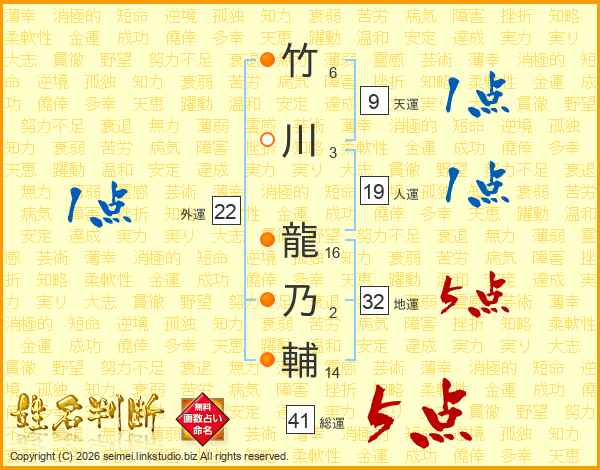 竹川龍乃輔さんの総運は41画の5点!