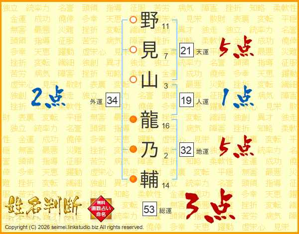 野(11画)見(7画)山(3画) 龍(16画)乃(2画)輔(14画)