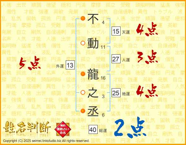 不(4画)動(11画) 龍(16画)之(3画)丞(6画)