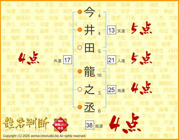 今(4画)井(4画)田(5画) 龍(16画)之(3画)丞(6画)