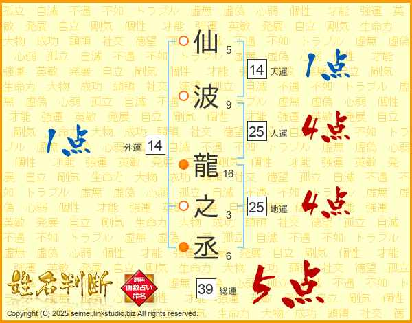 仙(5画)波(9画) 龍(16画)之(3画)丞(6画)