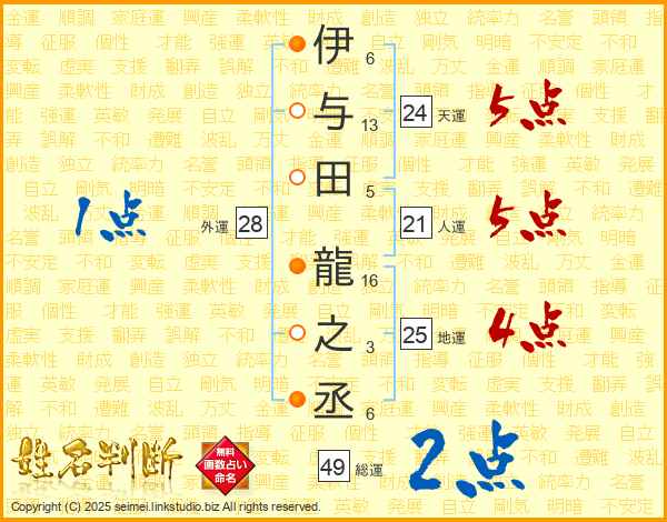 伊(6画)与(13画)田(5画) 龍(16画)之(3画)丞(6画)