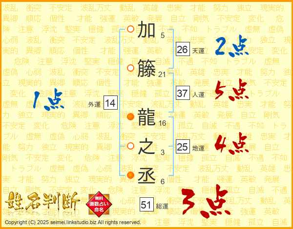加(5画)籐(21画) 龍(16画)之(3画)丞(6画)