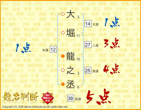 大(3画)堀(11画) 龍(16画)之(3画)丞(6画)