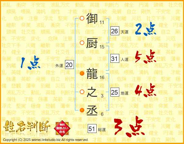 御厨龍之丞さんの総運は51画の3点!